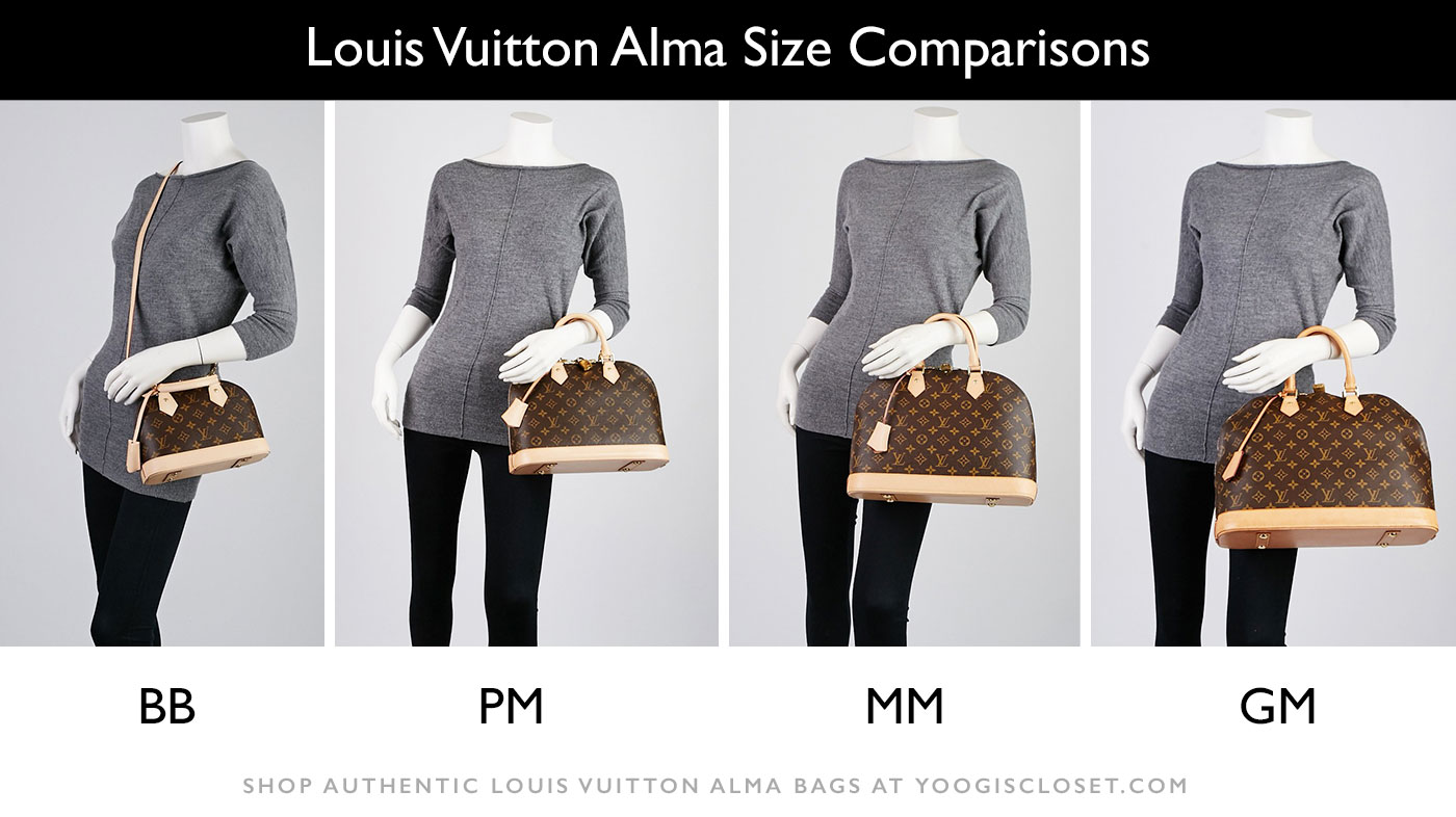 Using the Louis Vuitton Alma as an example, you can see the differences between the BB, PM, MM, and GM.